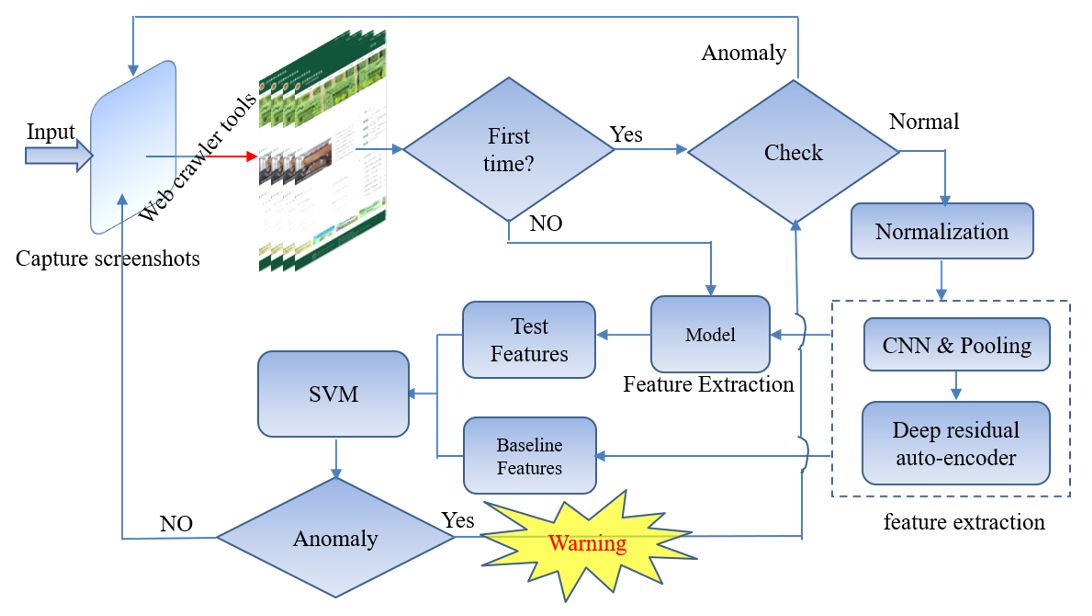 To improve the feature representation ability, a robust deep learning architecture for feature extraction is necessary. In this work, a residual attention auto-encoder and SVM combined architecture for feature learning and extraction is proposed, as demonstrated in Fig. 2. The deep residual attention autoencoder approach RAE-SVM is presented for detecting the anomalous webpages. Firstly, the web crawler tools are employed for grabbing all the webpages screenshots within the preset domain name and establishing index marks with the domain name. Then the model identifies whether this domain name appears for the first time and checks whether it is abnormal. If not, put it into the classifier for feature extraction, and the extracted features are used as the baseline features. If the domain name does not appear for the first time, then input them into the classifier for prediction. Once the prediction results indicate that the webpage is abnormal, an alarm will be sent automatically.