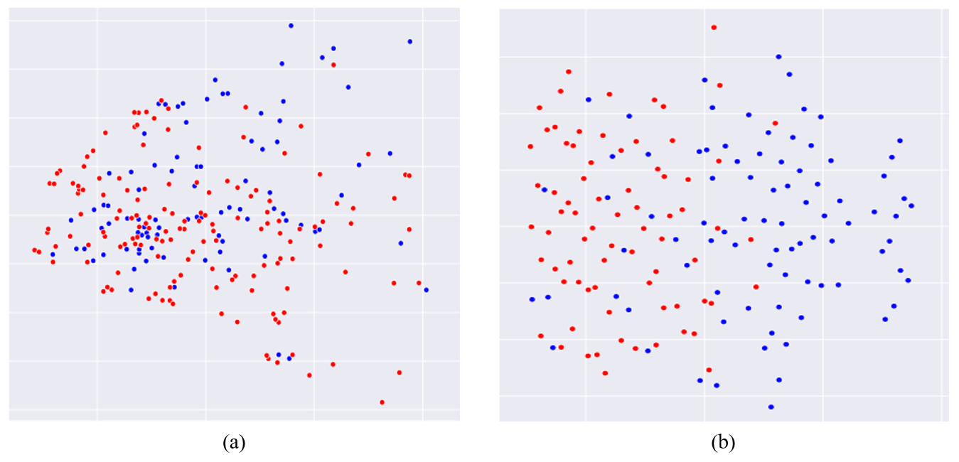 This study employs the high-performance computing (HPC) platform with Cent OS 8 Linux operating system, where 2×NVIDIA 2080 Ti graphics processing units (GPU) are adopted for accelerating calculation speed. In this work, 1,291 screenshots of second-level images were captured site under more than 50 websites within the domain name of Northeast Agricultural University. Part of the captured webpage images are shown in Fig. 4(a). The invaded web images are annotated manually by adding random images, and part of them are shown in Fig. 4(b). The distribution of positive and negative samples can be visualized by t-Distributed Stochastic Neighbor Embedding (t-SNE) in Fig. 5, where the blue dots denote the normal web images and the red ones denote the tampered web images. It is obvious that the normal and tampered webpage images are hardly distinguished from each other.